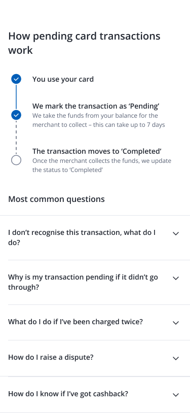 Customers checking transactions were often worried, in a time sensitive situation, or looking for clear answers. The content had to reassure quickly – without being vague or sending people down unnecessary paths – so they could act with confidence.